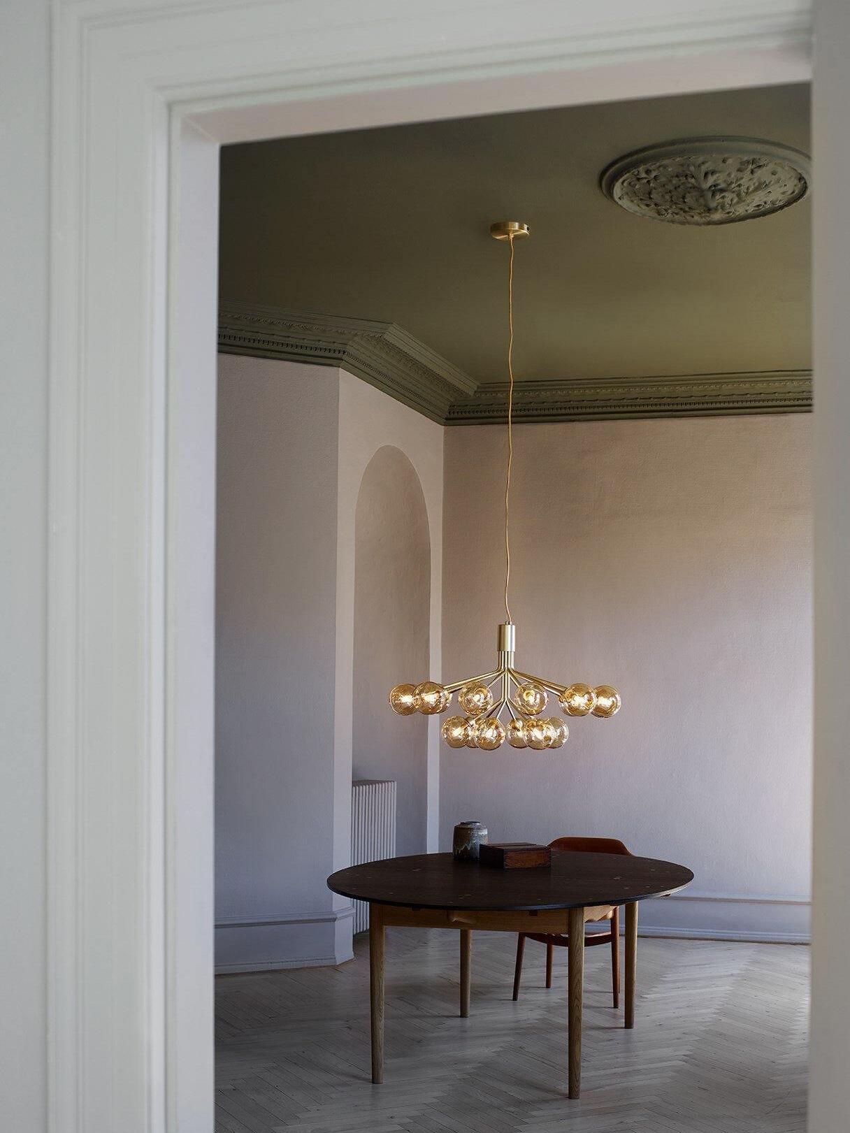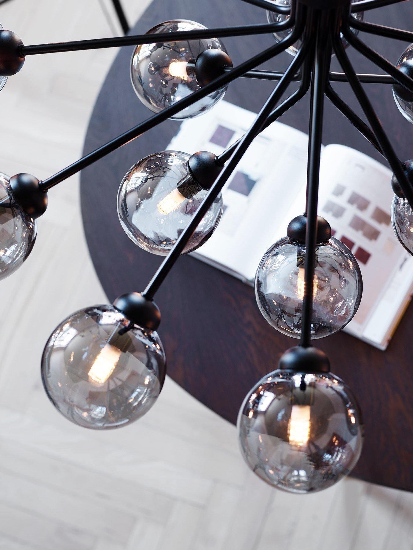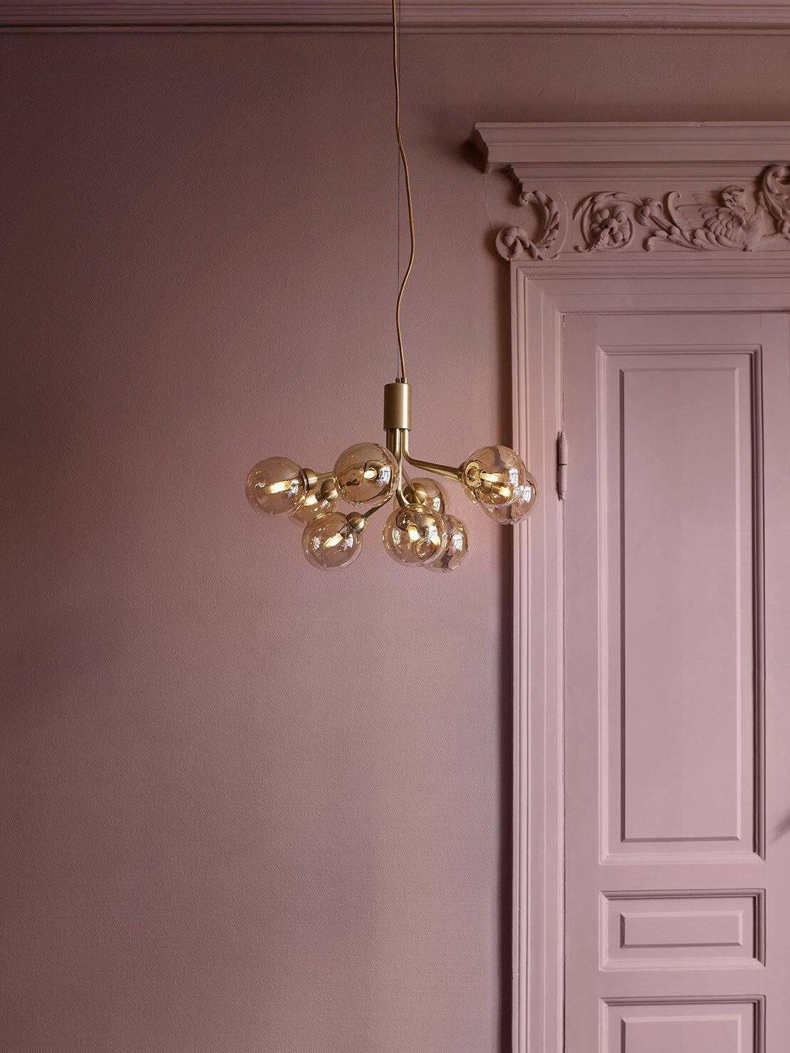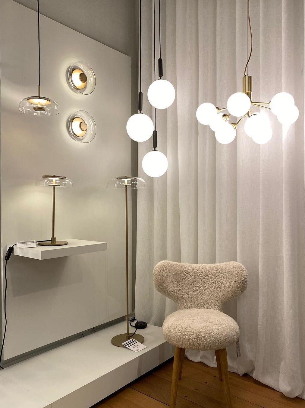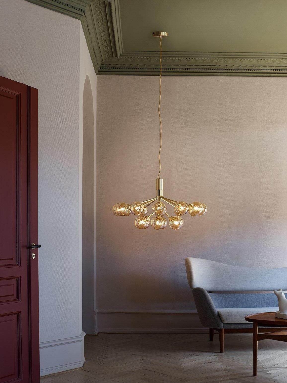 Ispirandosi ai fiori, Sofie Refer ha disegnato la nuova collezione di lampadari Apiales. La collezione è composta da due lampadari con 9 o 18 globi in vetro soffiato a bocca, disponibili con finitura ottone spazzolato dorato o nella morbida finitura nero satinato. Da un rosone realizzato appositamente, i bracci si aprono come steli di fiori, da cui la luce si diffonde con grazia.